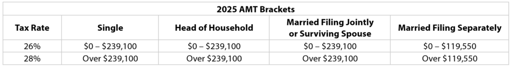 Like the regular tax brackets, the AMT brackets are annually indexed for inflation. In 2025, the threshold for the 28% bracket will increase by $6,500 for all filing statuses except married filing separately, which will increase by half that amount.